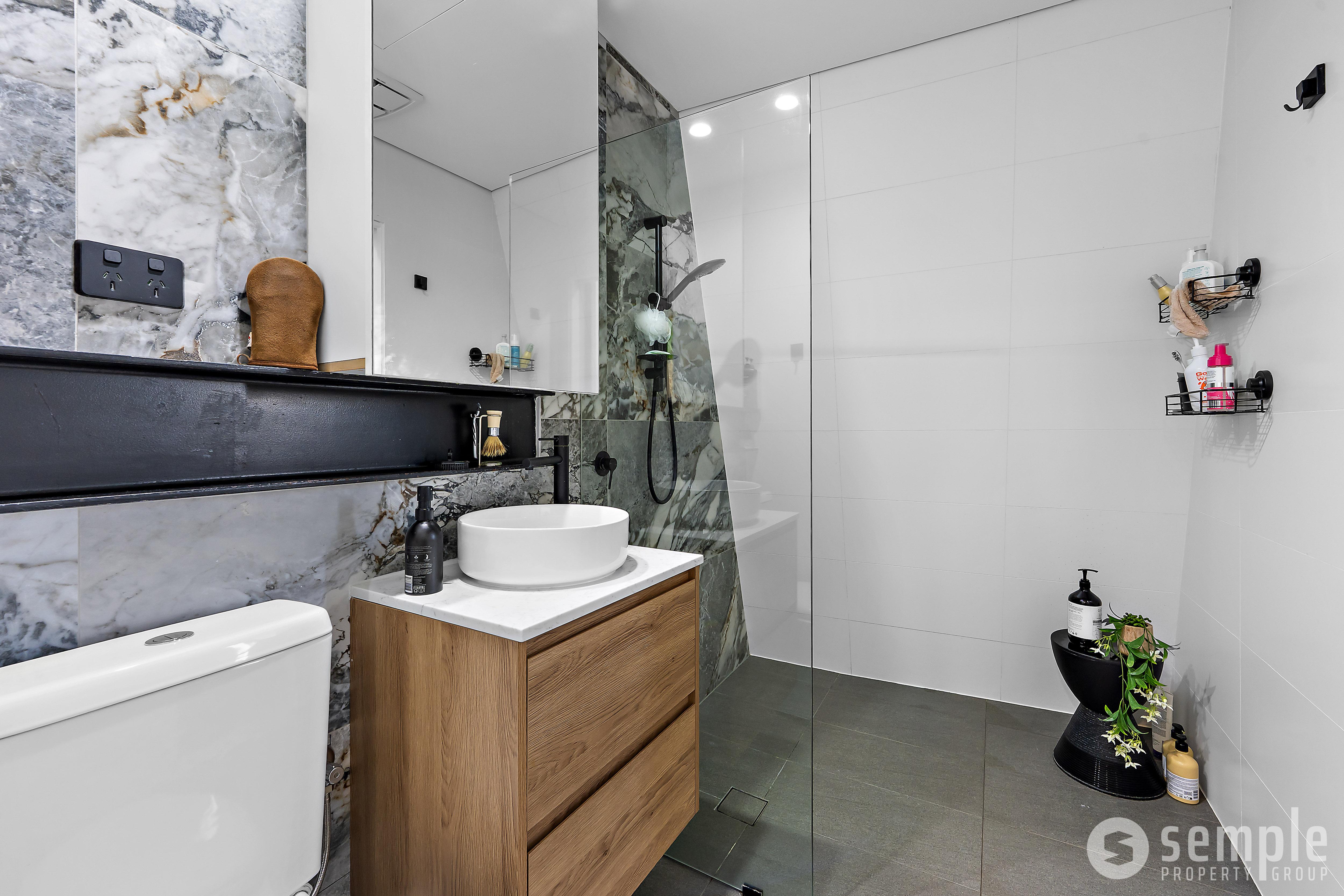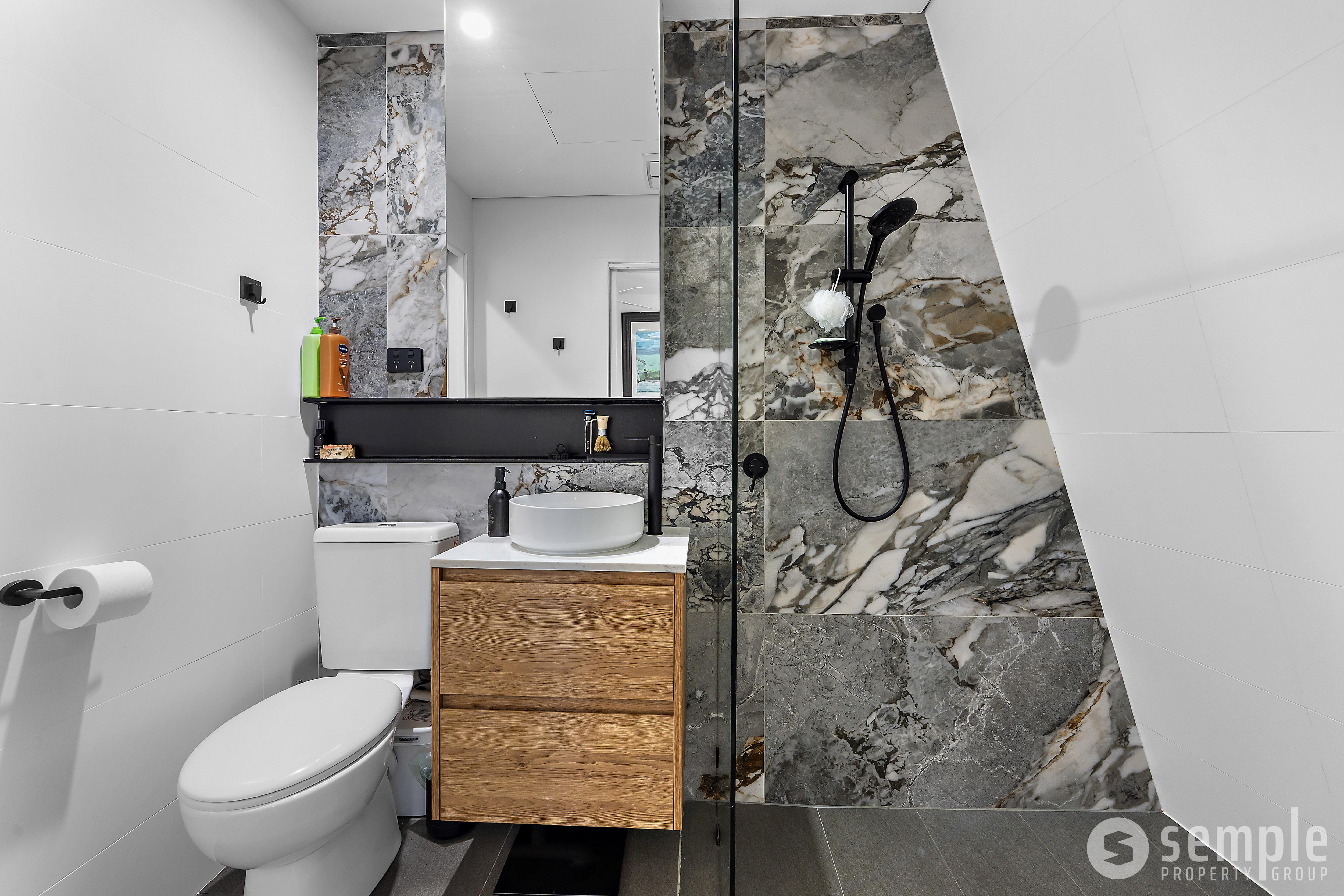 – Modern bathroom with sleek shower, vanity and toilet