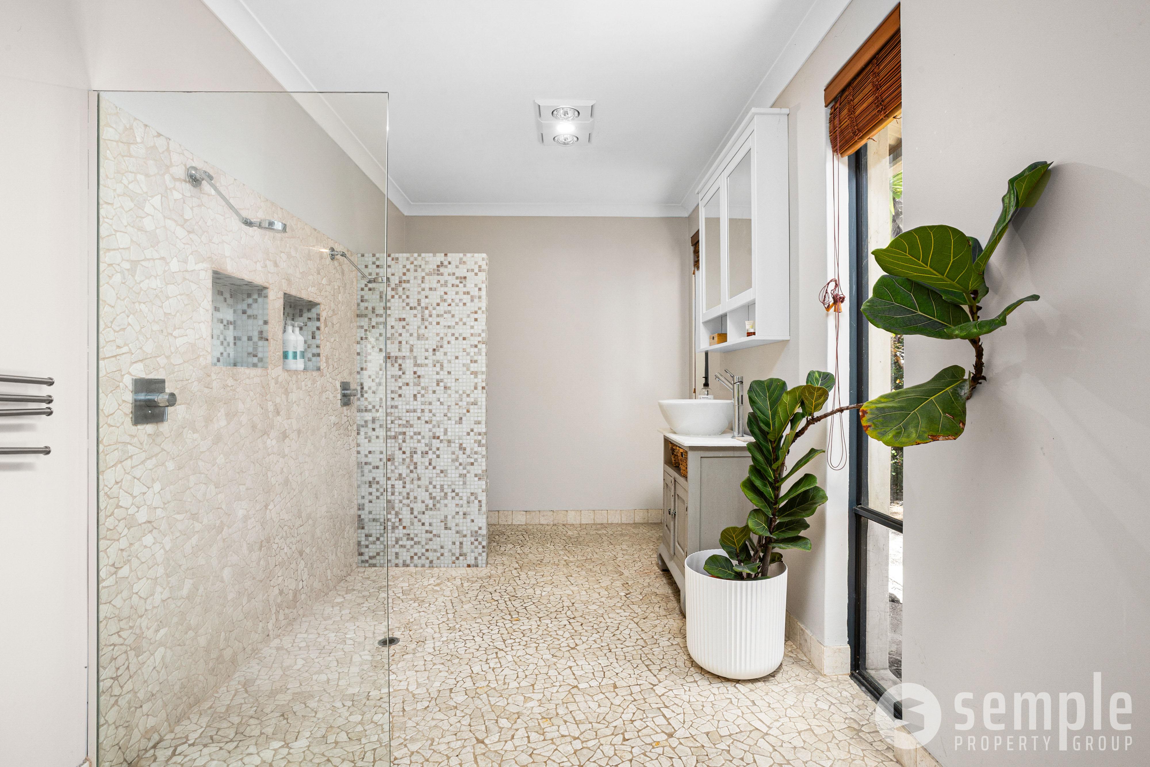 The Master Bedroom suite is a true haven, privately situated at the back of the home. It features a large walk-in robe and gorgeous double timber doors leading out to your own private sanctuary-complete with a magical outdoor shower perfect for watching sunsets on warm summer nights. The open-plan ensuite is a designer’s delight, showcasing pebble stone flooring, vanity, double shower with double shower heads and a walk-in toilet.