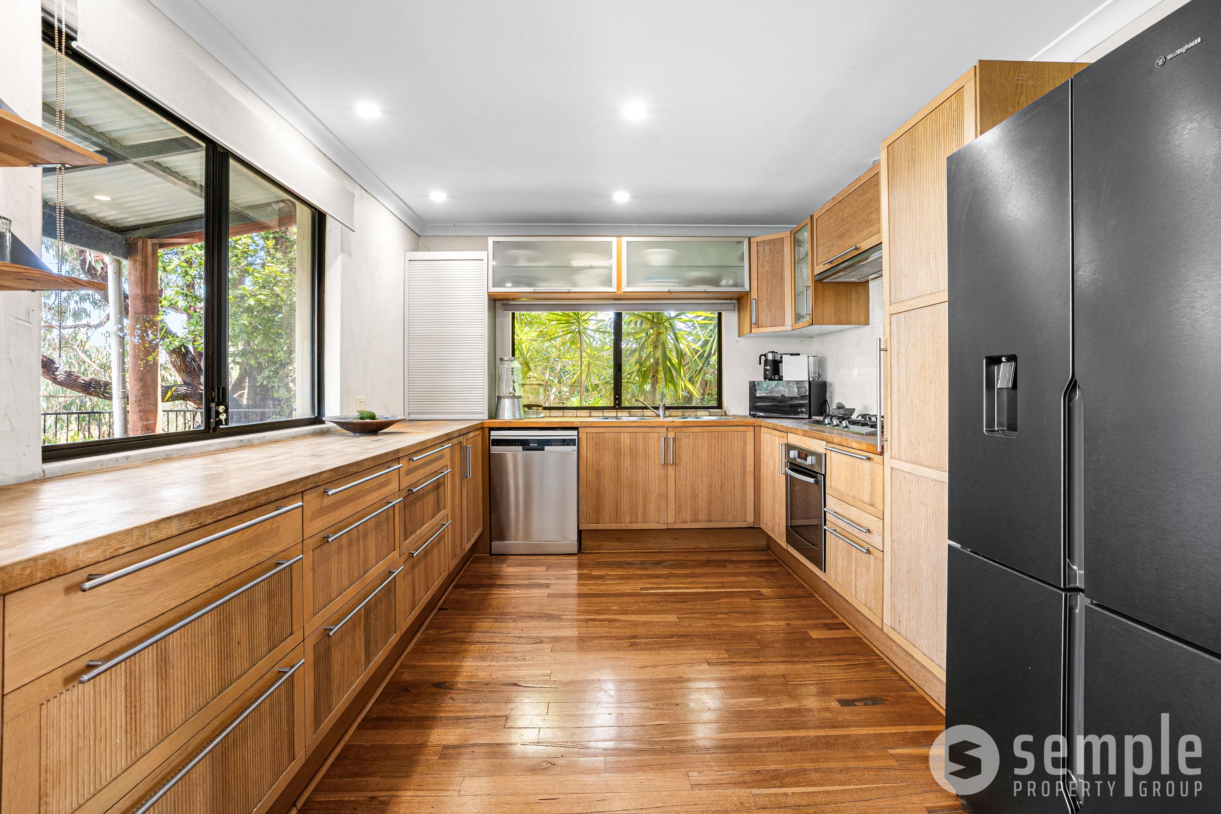 The separate kitchen is a warm, functional space with timber benchtops, abundant drawers and cupboards, gas hot plates, an electric oven, dishwasher, pull-out pantry and a handy appliance cupboard.