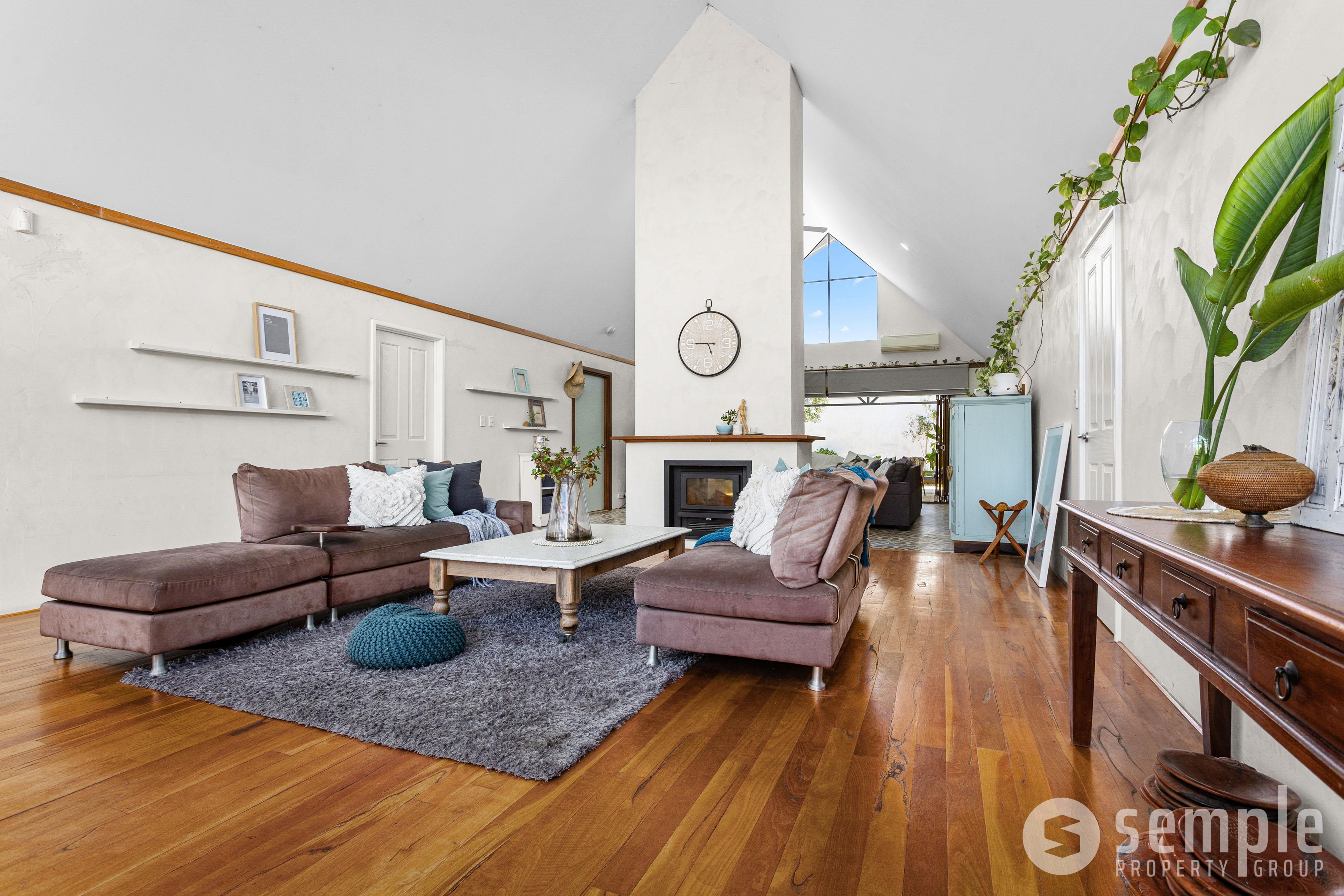 Step inside to a colossal main living area boasting a dramatic 45-degree pitched ceiling. The huge space is cleverly split into two separate zones, warmed and separated by a double-sided wood fireplace.