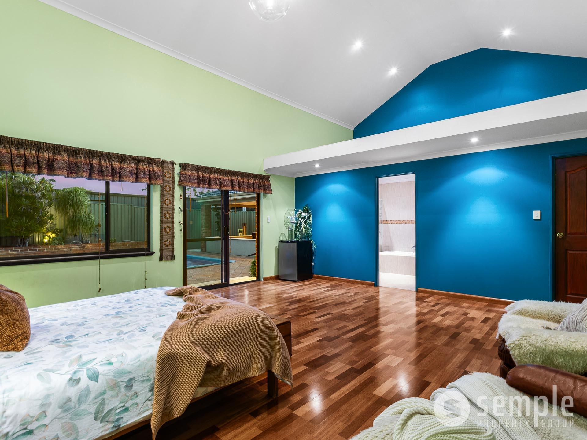 • Master bedroom: Generous size with real wood flooring, High ceilings and a storage loft, Split system air conditioning, Direct access to pool area, Ensuite bathroom with floor-to-ceiling tiles, shower, bath, and vanity