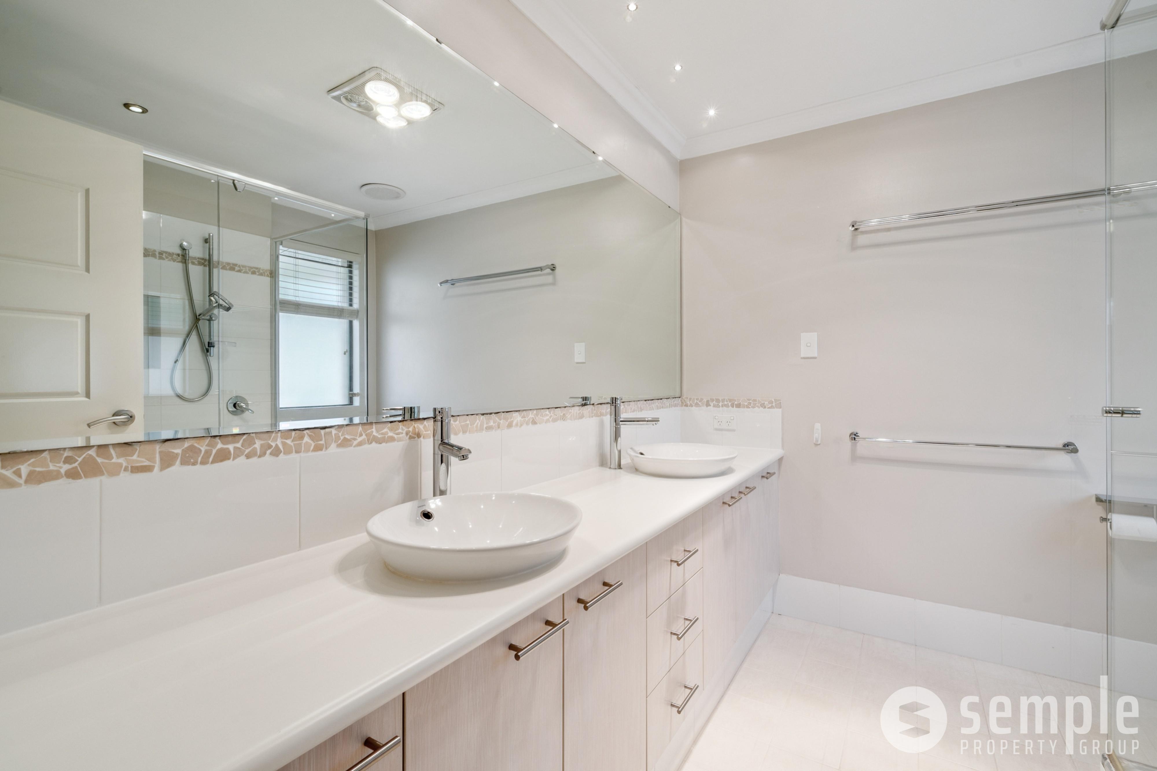 • Large ensuite with full-length mirror, double raised basins, and heat lamps. Double-sized glass-framed, screened shower with modern fittings. Ample under-bench storage throughout.