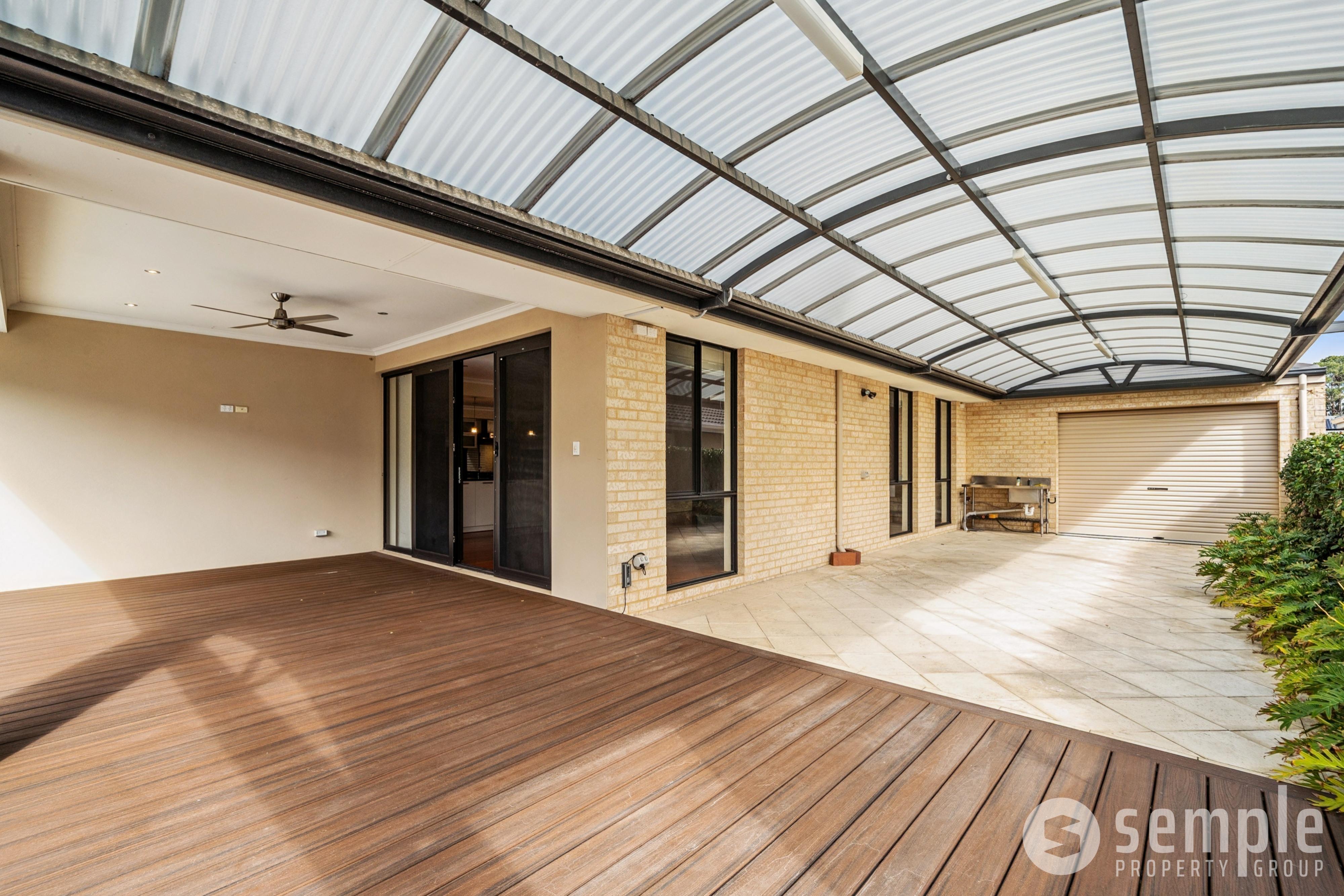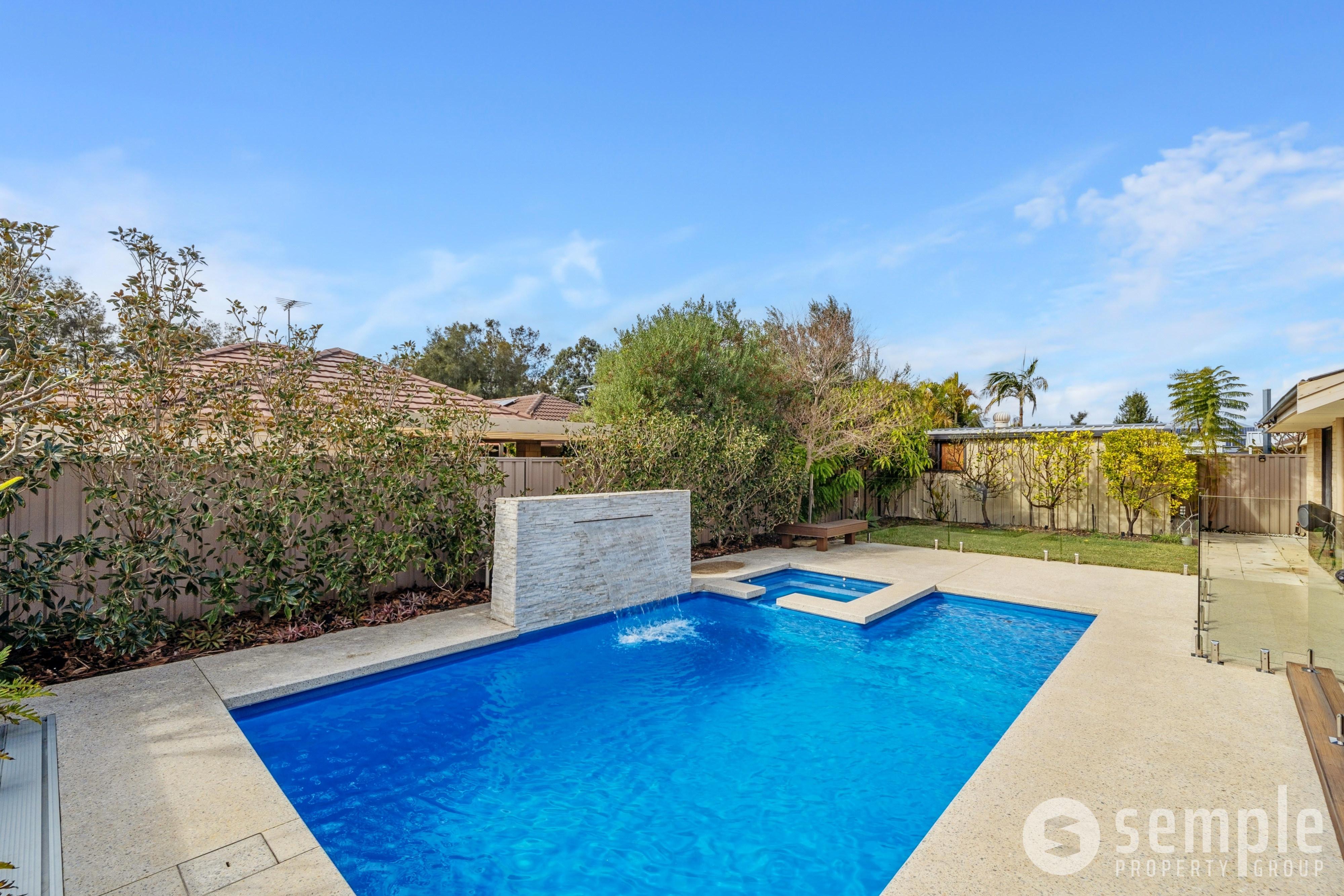 • Covered alfresco area with hybrid timber-look deck. Overhead ceiling fan and Nu-Style shutters allow for year-round use. Stunning freshwater below-ground pool with spa jets & waterfall feature.