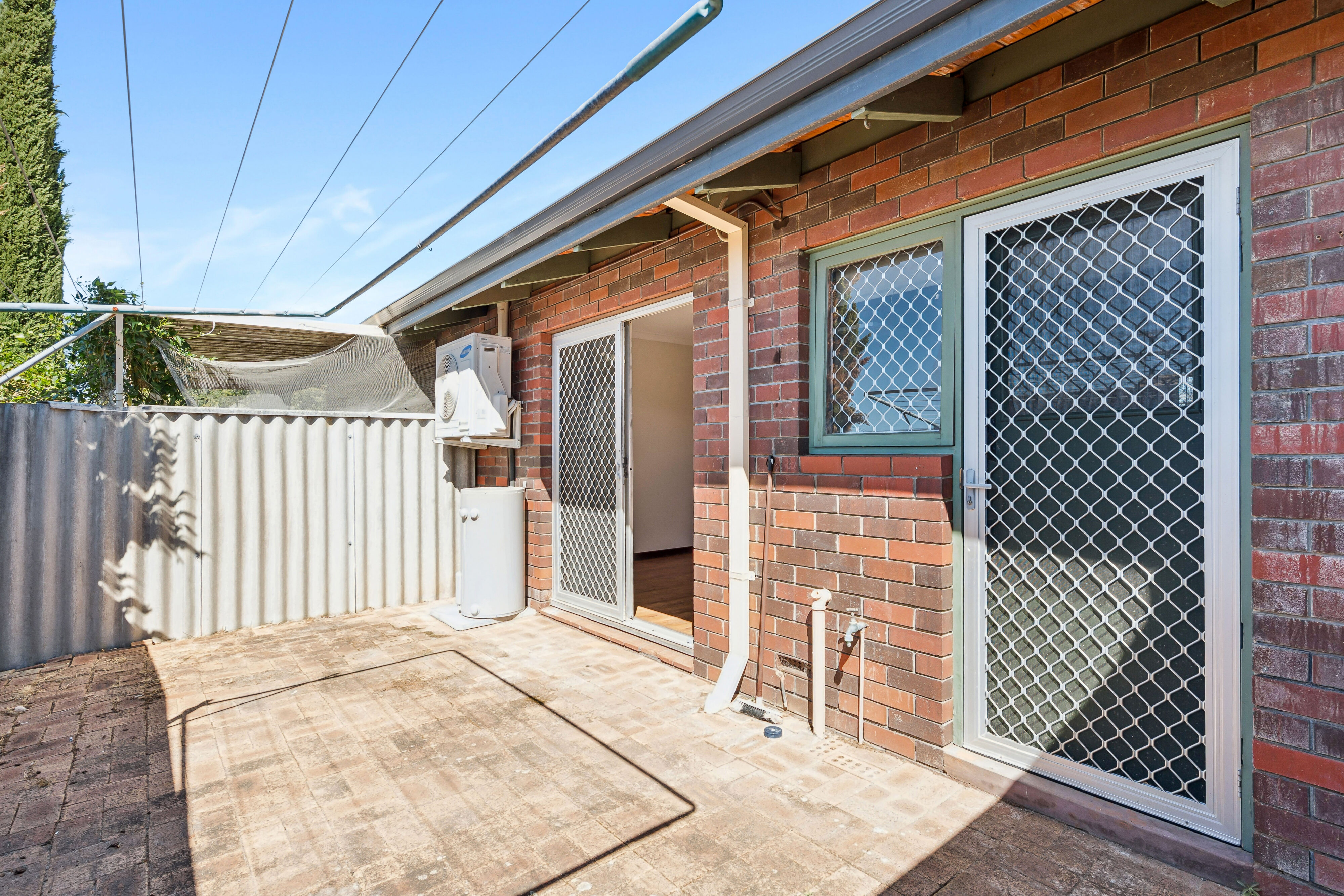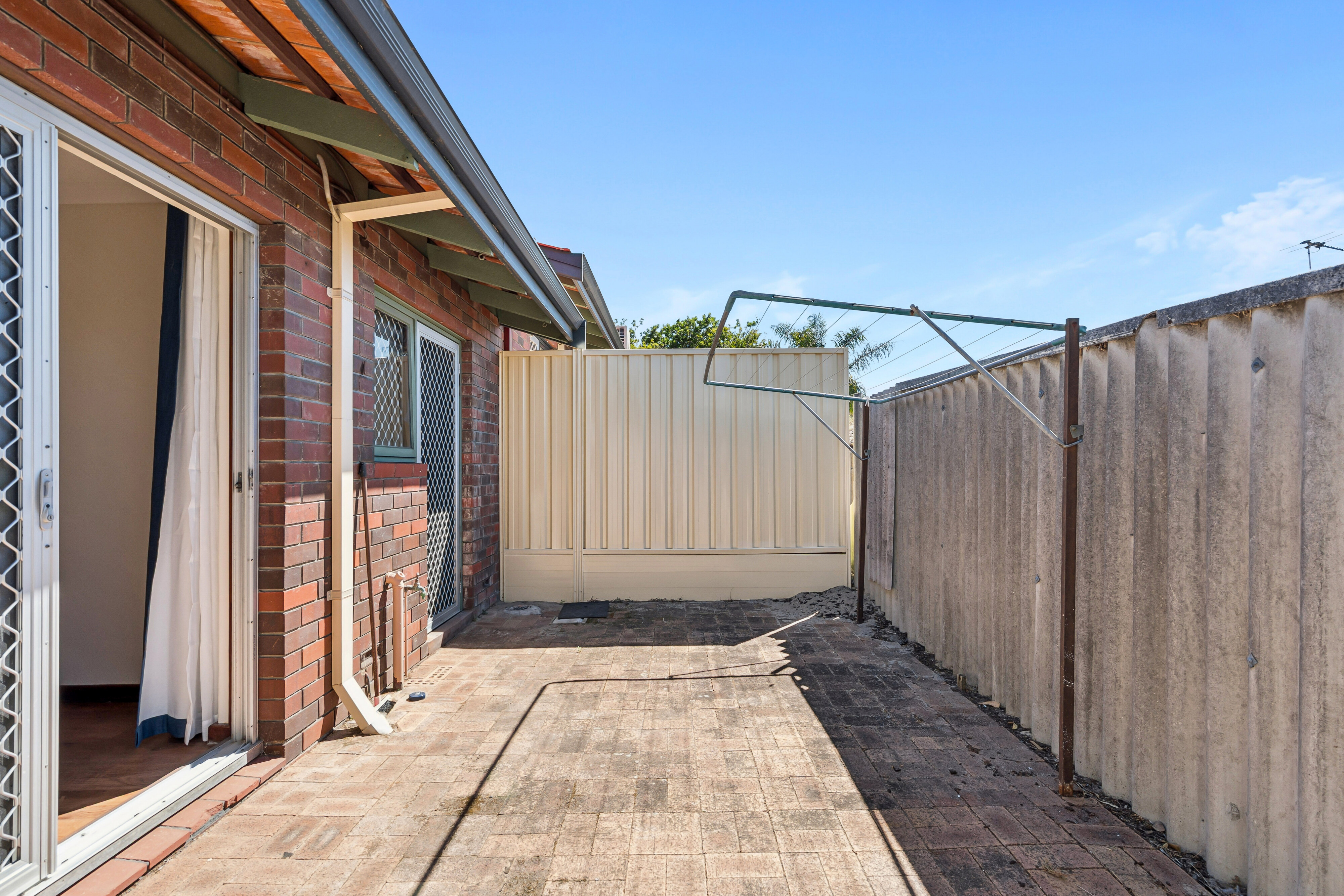 he backyard is low maintenance with pavers throughout.