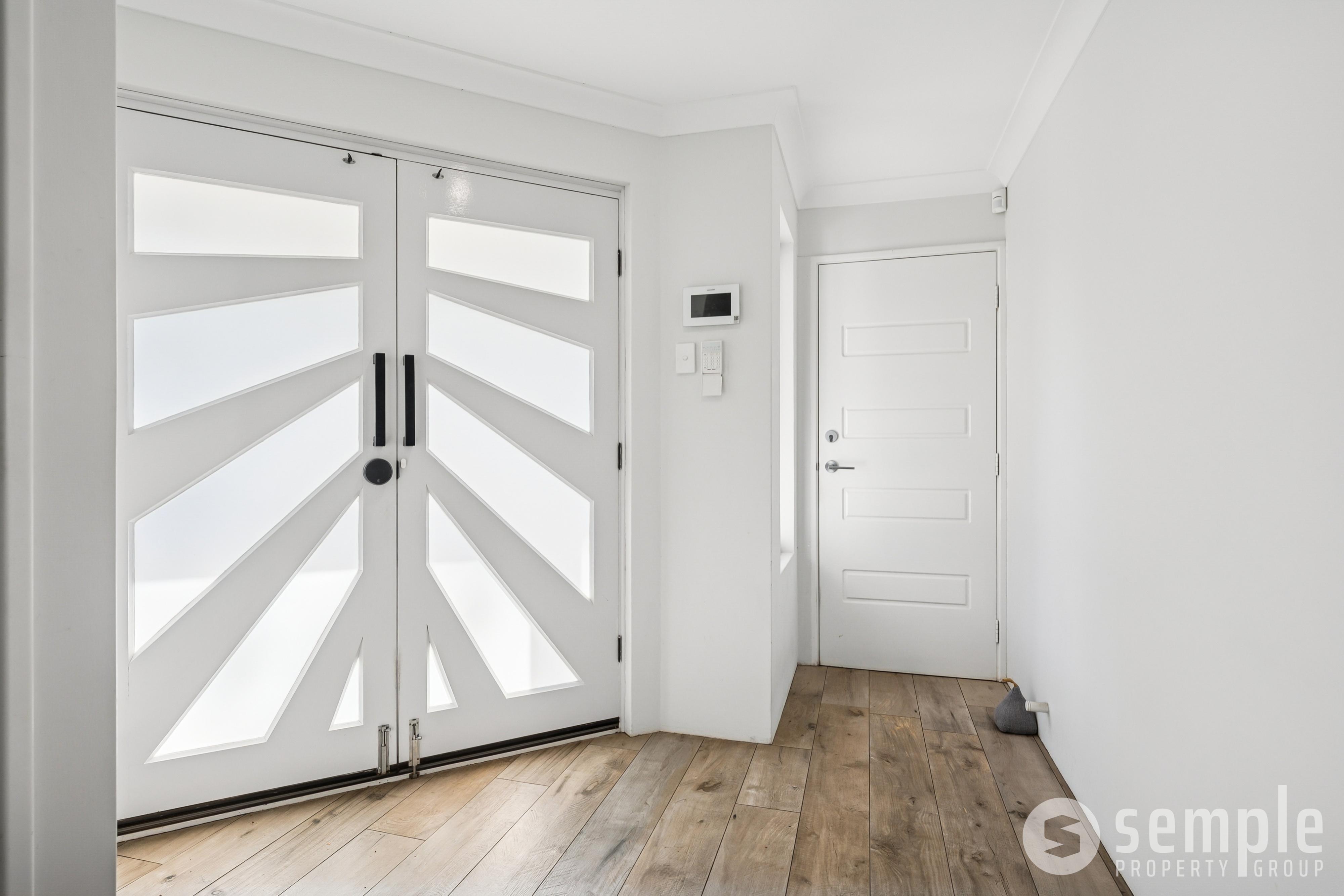 • Modern double front doors with geometric panel detailing.