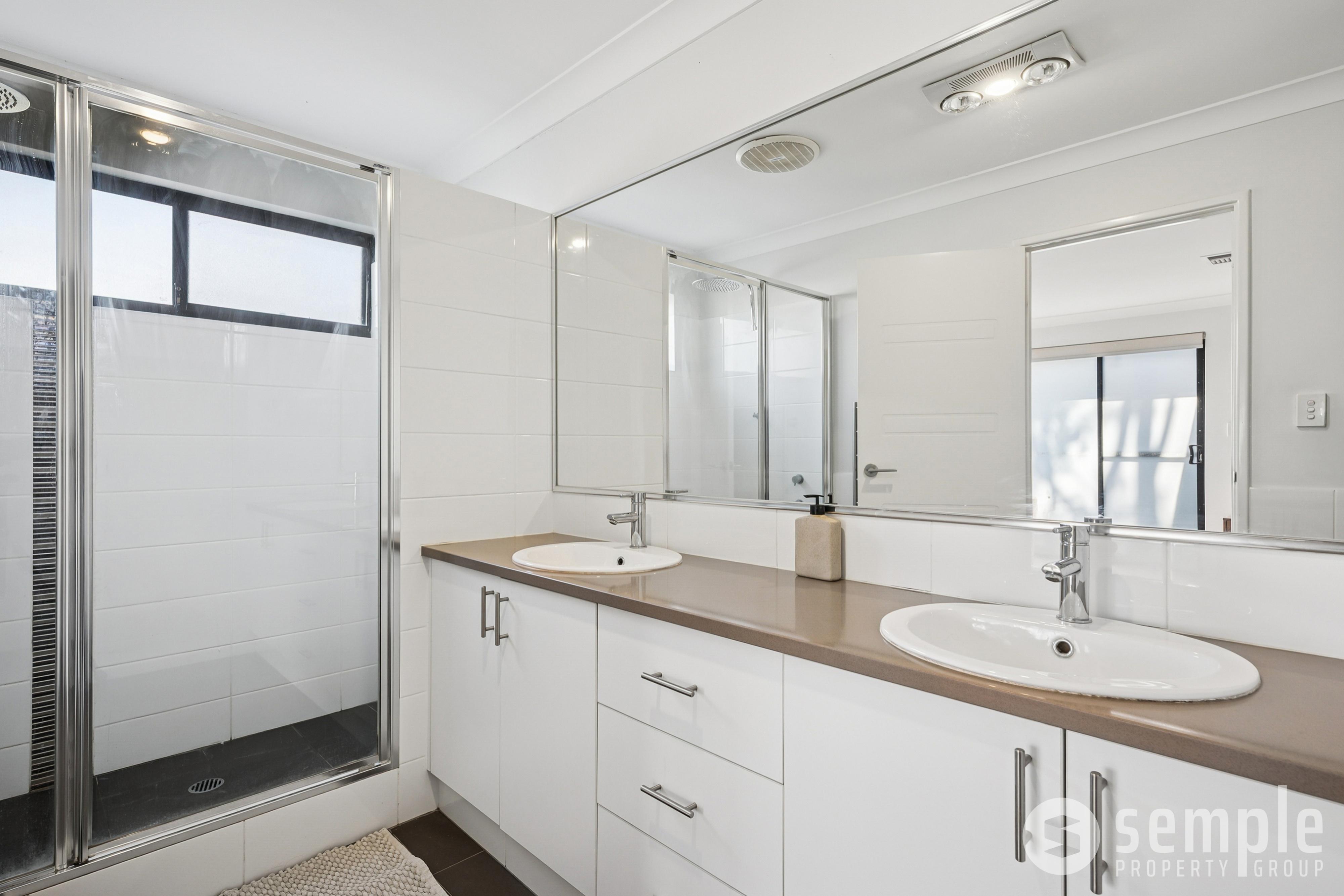 • The ensuite boasts his & hers basins with large vanity. An excess of storage with drawers & cupboards. Heat lamp & large shower recess for extra comfort.