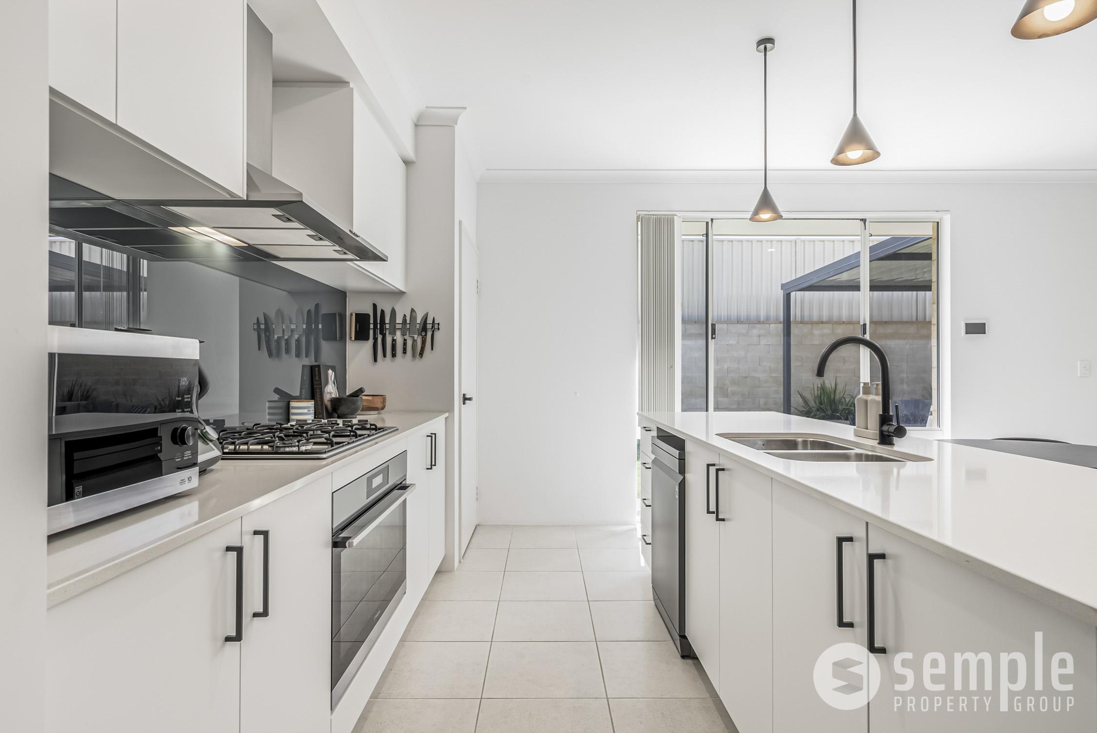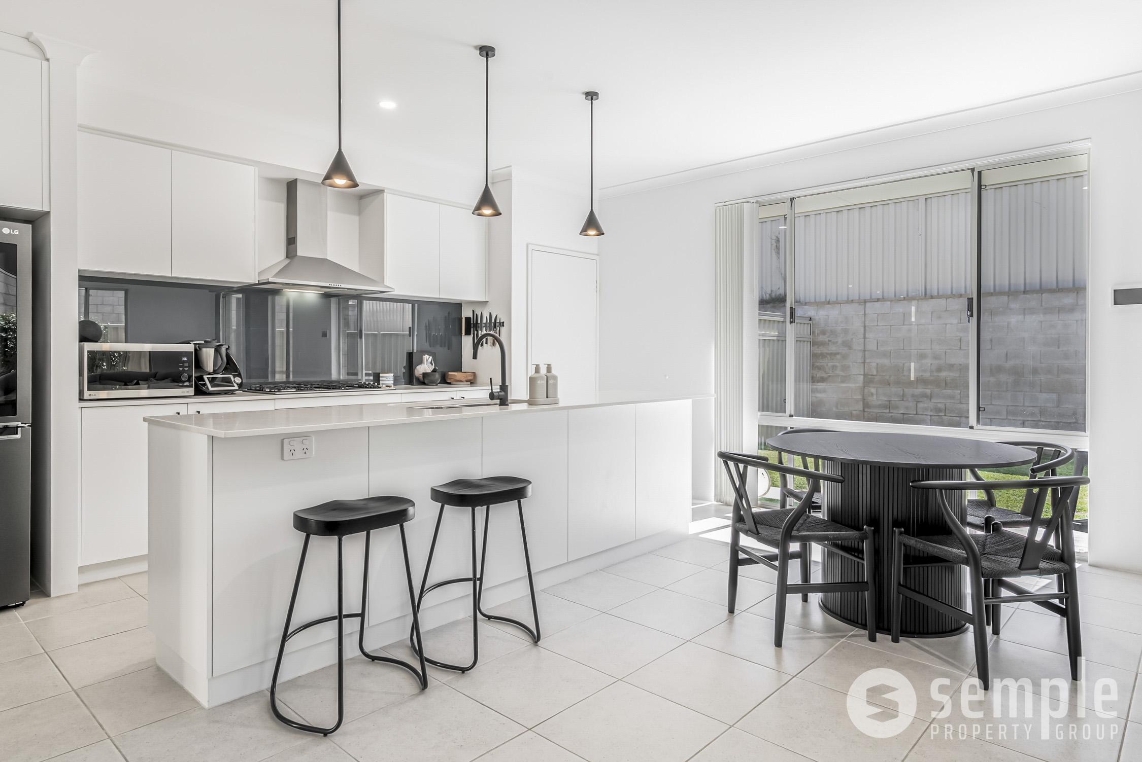At the heart of the home is the open-plan kitchen, dining and living zone, where an impressive 31-course ceiling enhances the sense of space and natural light, creating an inviting area for everyday living and entertaining. The kitchen is both stylish and functional, featuring ample cabinetry, generous bench space, dishwasher, gas cooktop, extra wide oven and rangehood, dedicated pantry, glass splash back and pendant lights – perfectly suited to modern family life.
