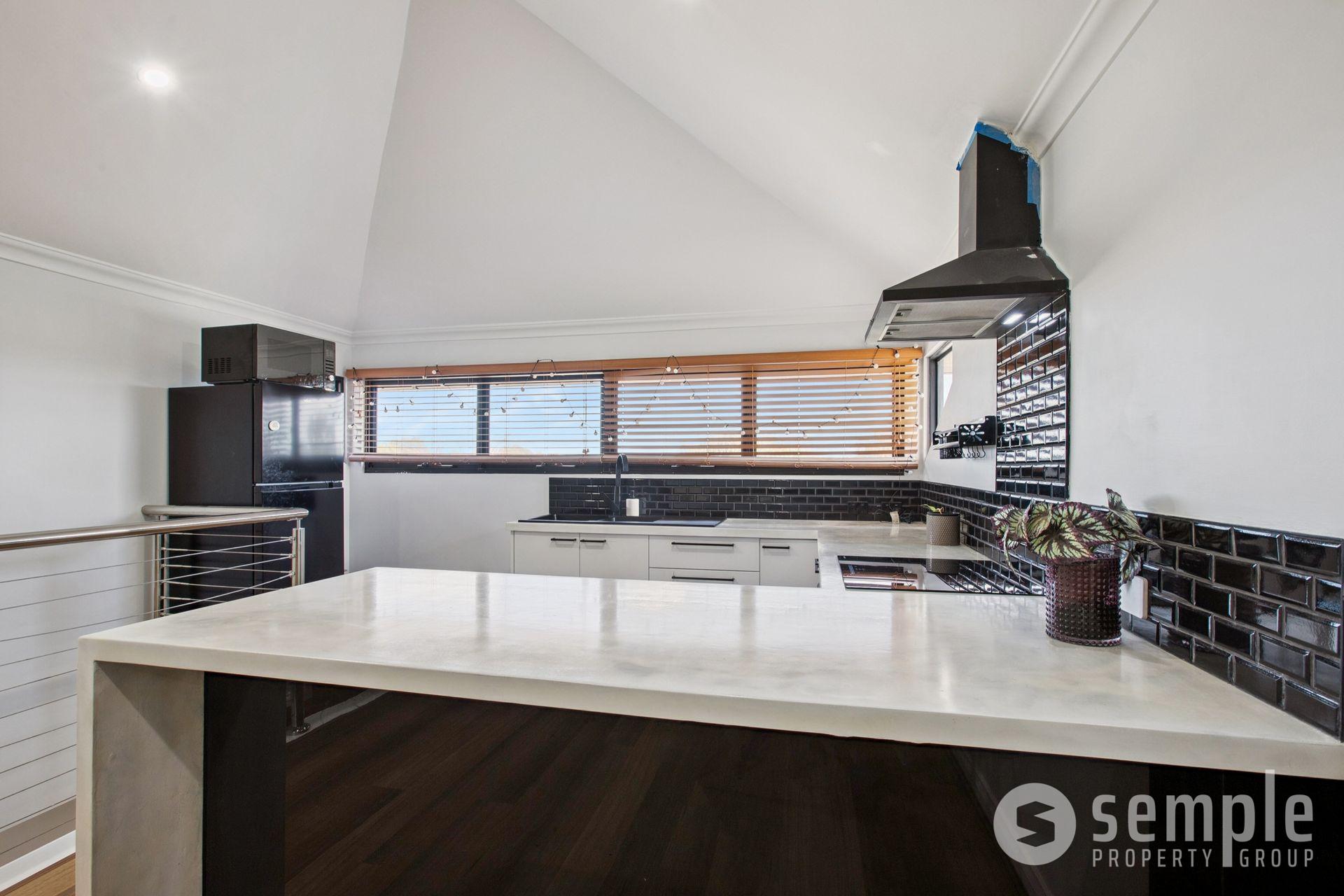• Kitchen upstairs includes double sinks, oven, electric cooktop, storage, and stone look benchtops