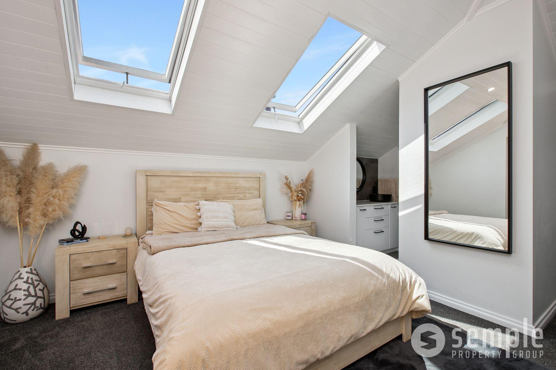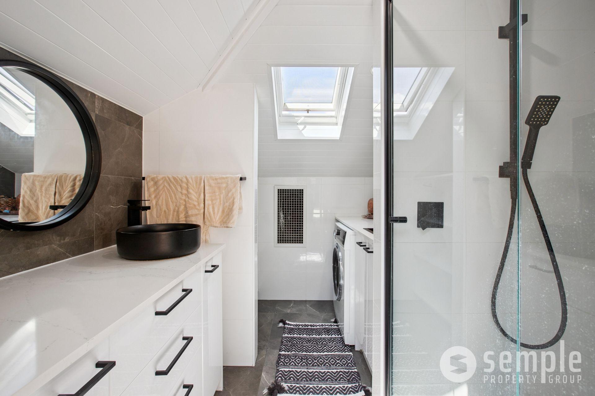 • 5th bedroom with walk-in robe, Velux skylight windows, gabled ceiling, and ensuite/laundry with shower, vanity, toilet and space for washer and dryer