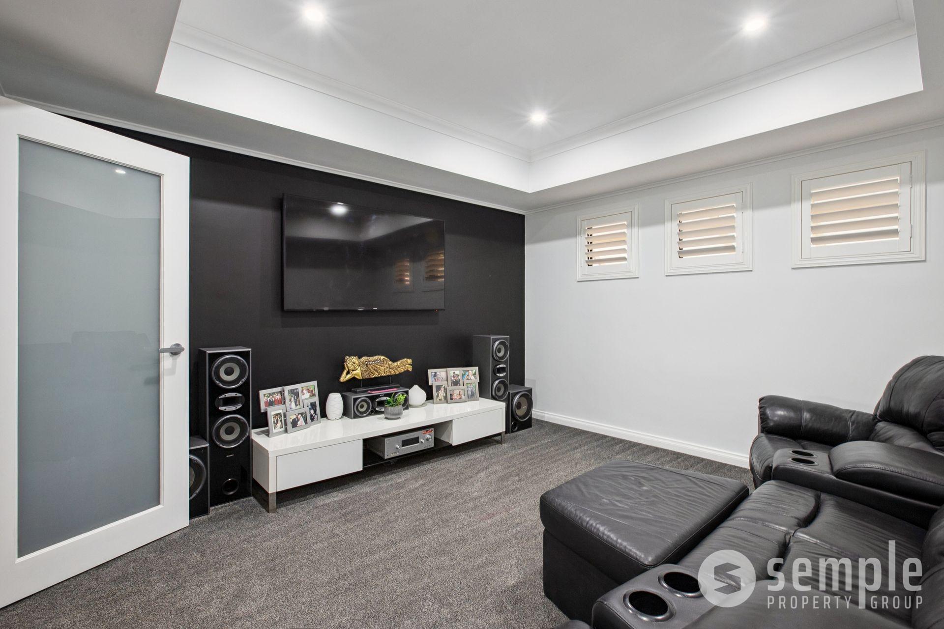 • Theatre room with coffered ceilings and plantation shutters
