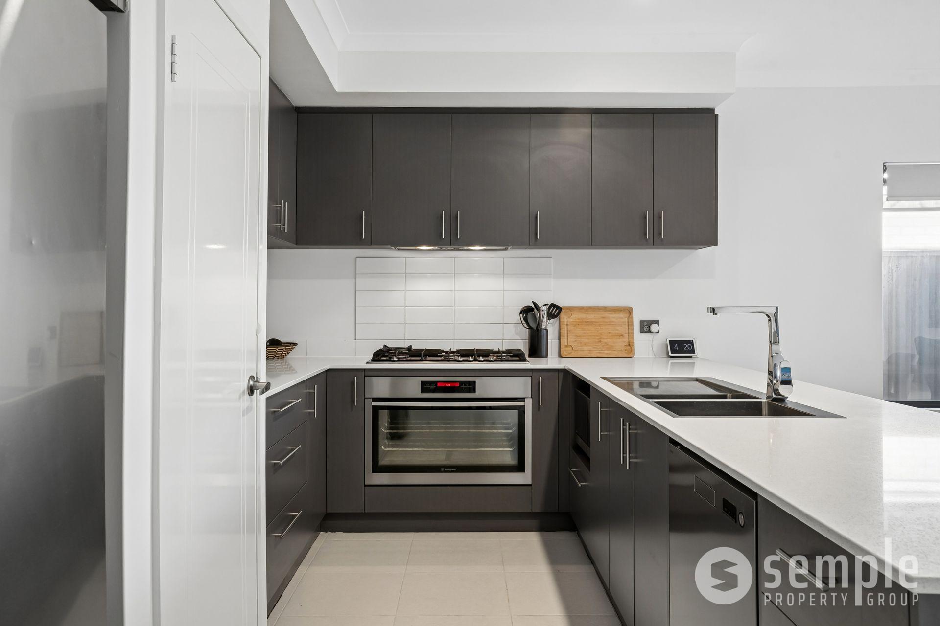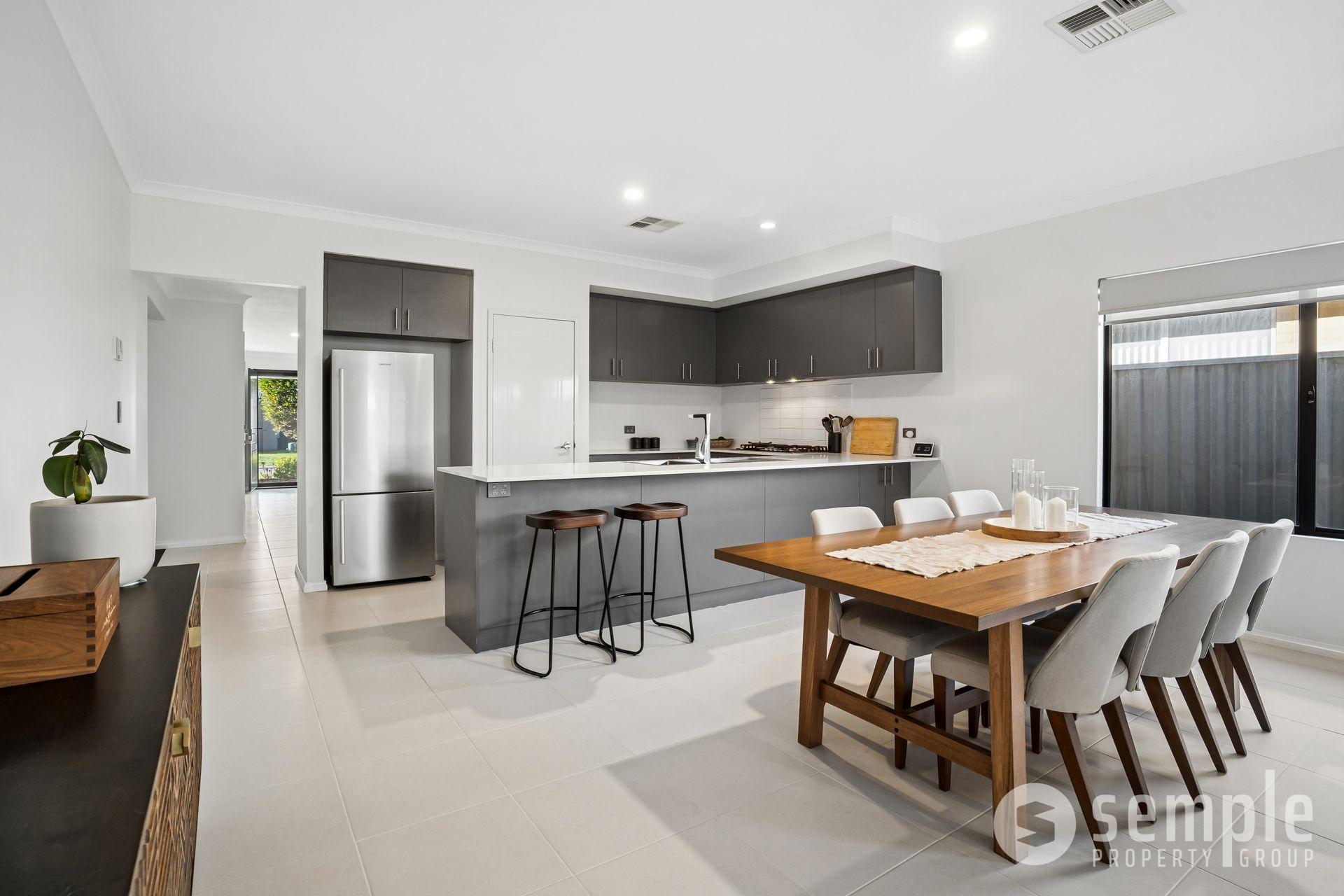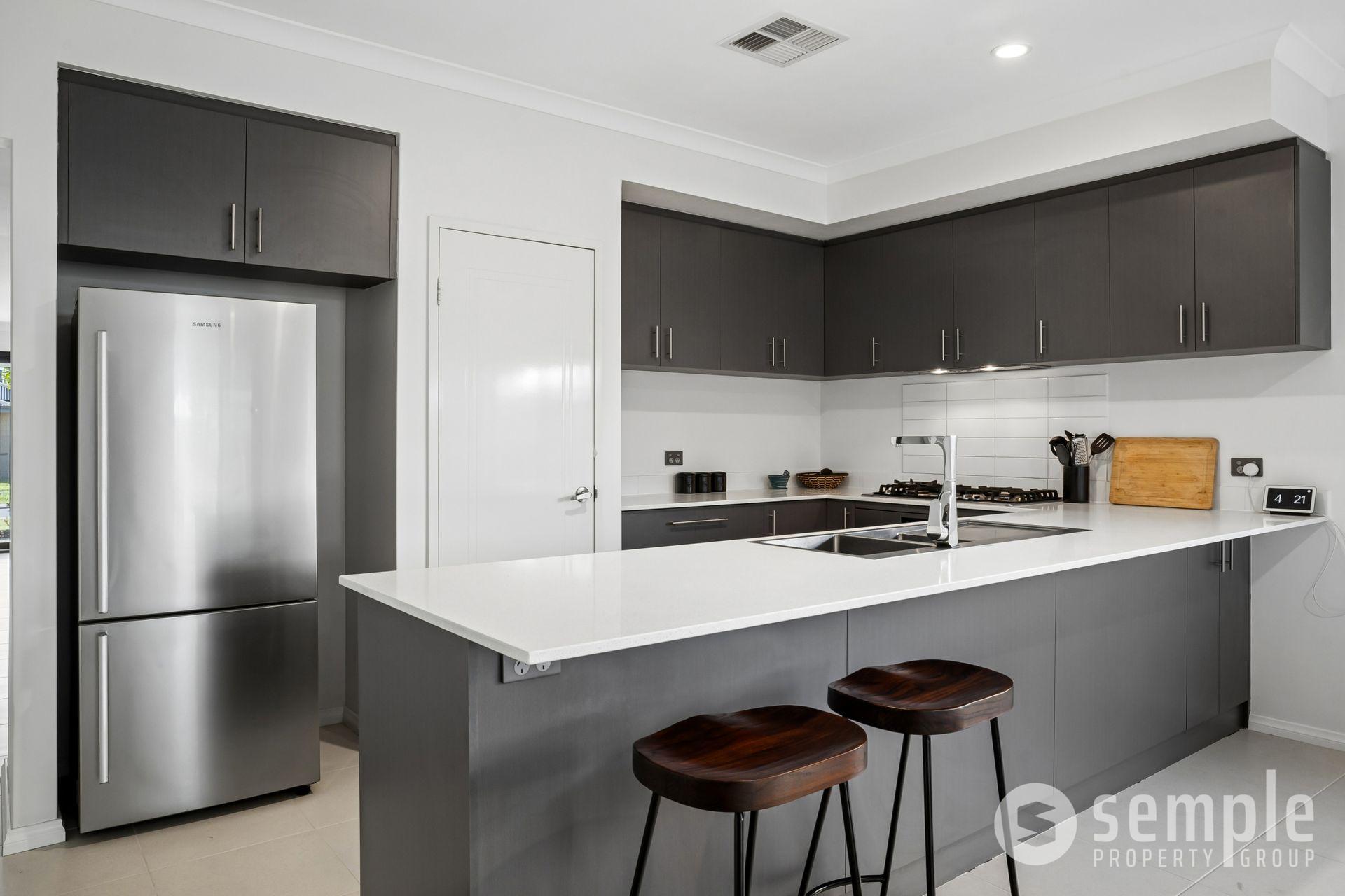 At its heart, the open-plan kitchen, living, and dining area is designed for connection and comfort, flowing seamlessly to the outdoor space. The kitchen is a standout, featuring stone benchtops with a breakfast bar, 900mm appliances, and ample storage, ideal for both everyday use and entertaining.
