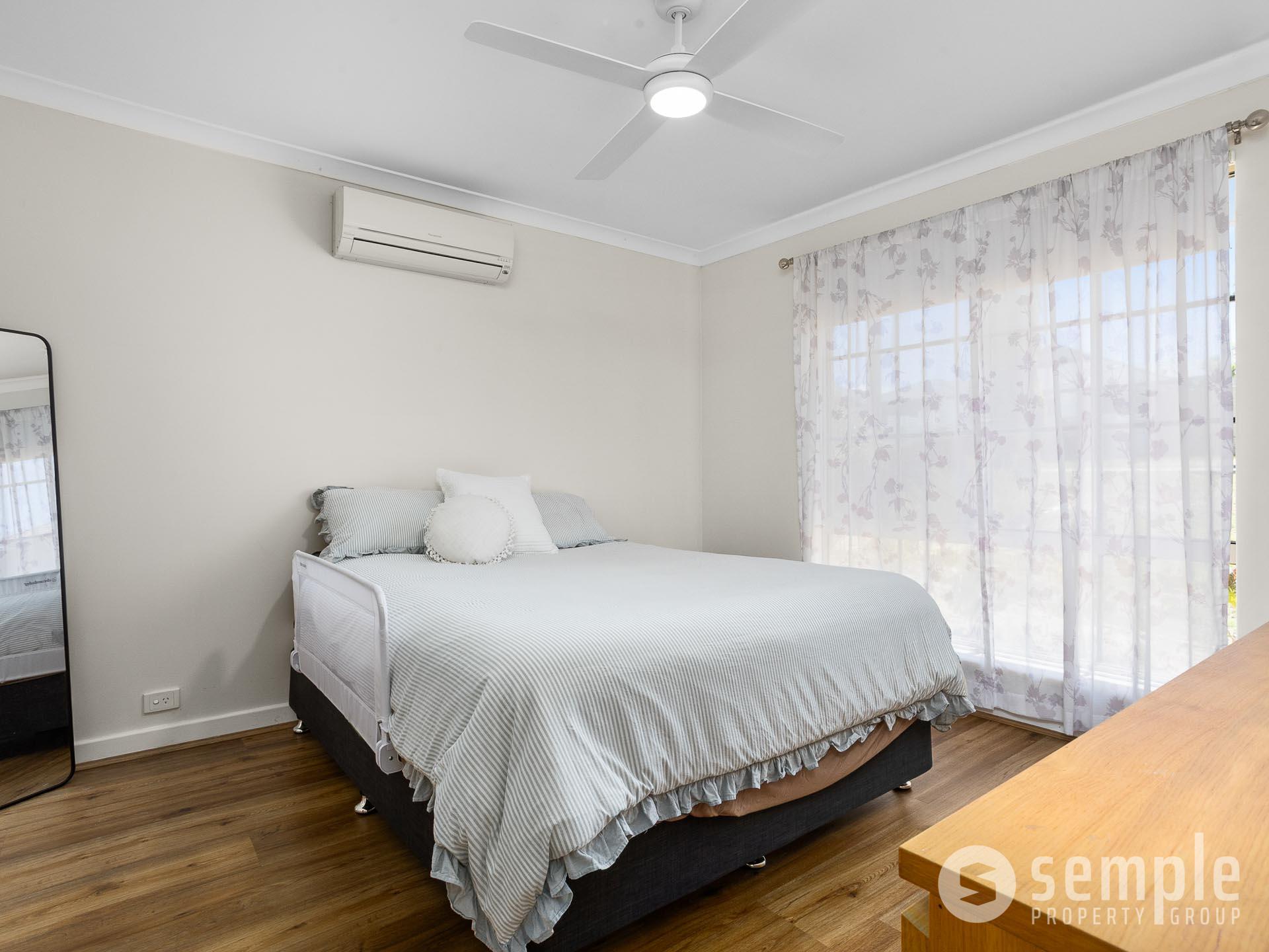 • Spacious master bedroom with built-in robe, flooring, ceiling fan, and reverse cycle split system air conditioning