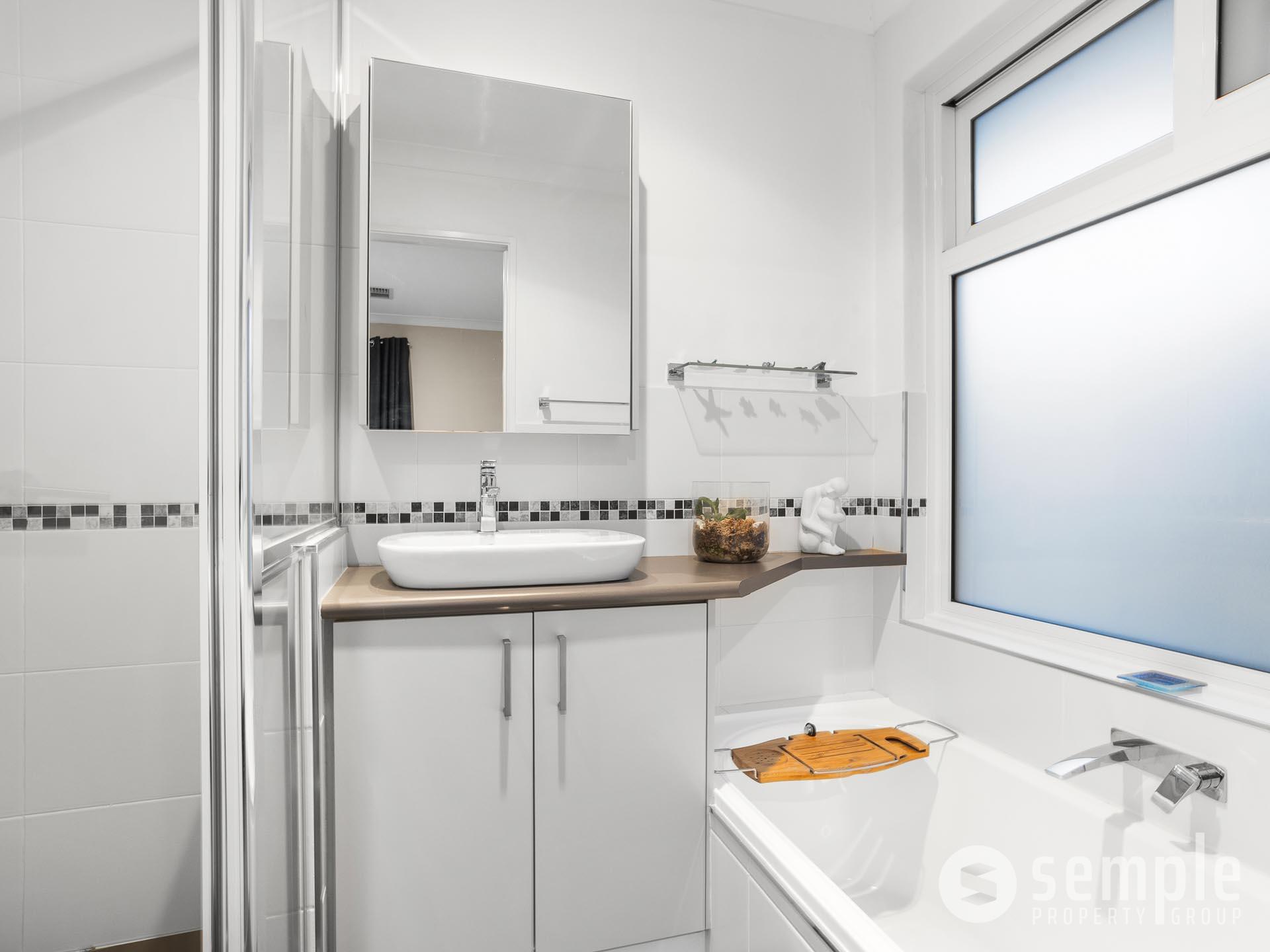• Semi-ensuite bathroom with bath, vanity and shower